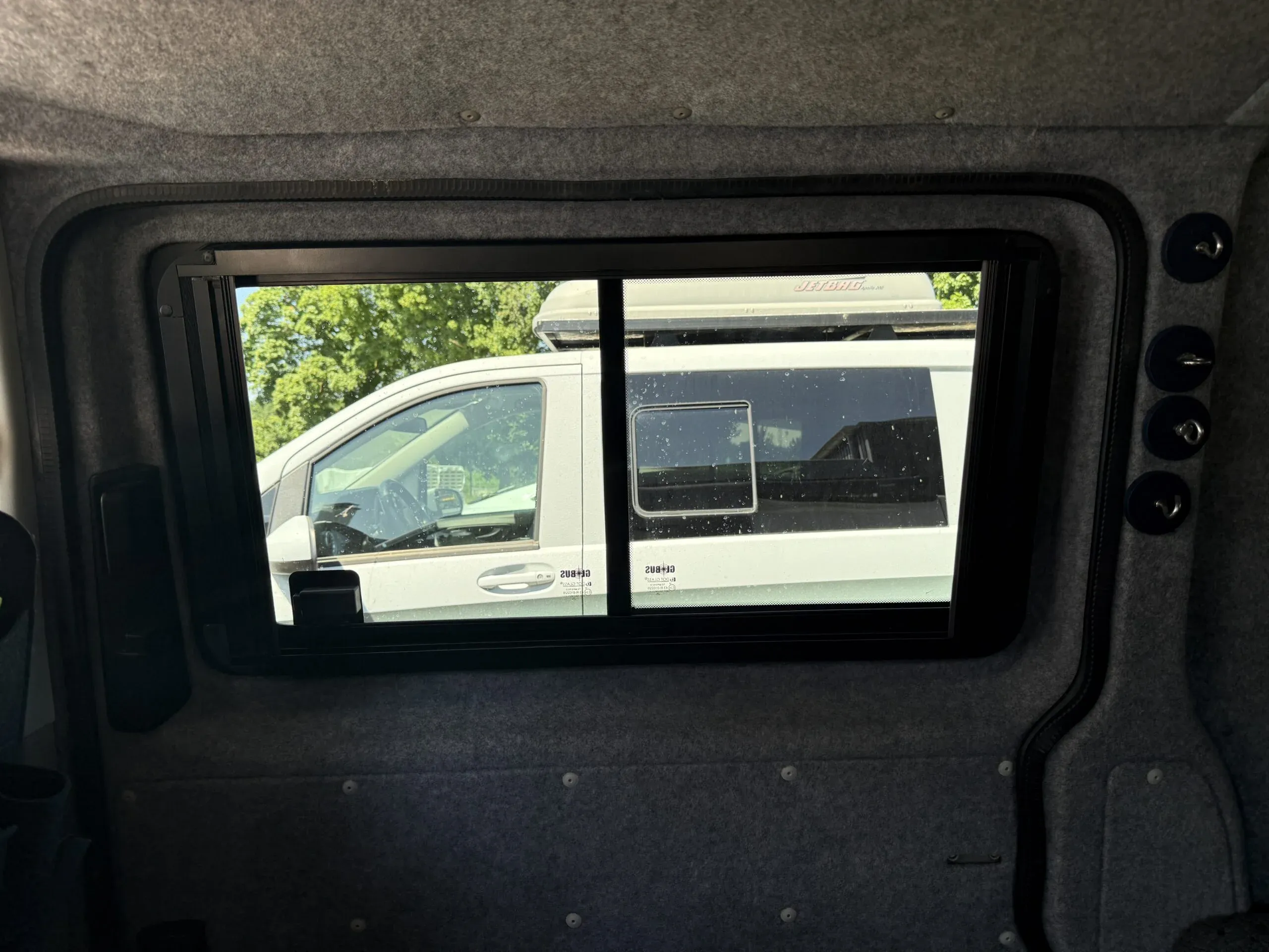 Die Montage gestaltet sich einfach und unkompliziert. Die Rahmen werden direkt auf das Schiebefenster VW T5 T6 mit einer hochwertigen Dichtmasse aufgeklebt und anschließend sauber versiegelt. Dies sorgt für einen dauerhaften Halt und verhindert das Eindringen von Feuchtigkeit. Bei Bedarf kann im hinteren Bereich zusätzlich die Scheibe geschwärzt oder mit einer Tönungsfolie versehen werden, um die Verdunkelungswirkung weiter zu verstärken.